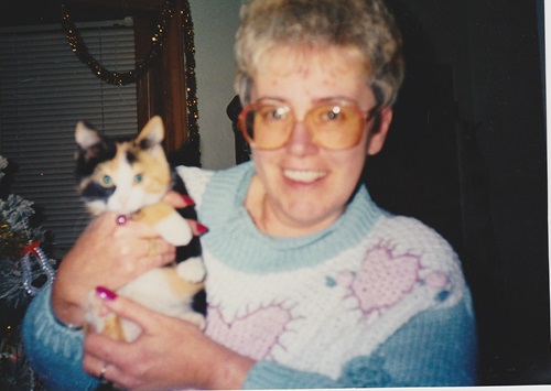 The picture shows my mom holding on to the only cat who ever lived in their house. I remember the cat was named Callie and it never seemed to want to be near anyone but mom.