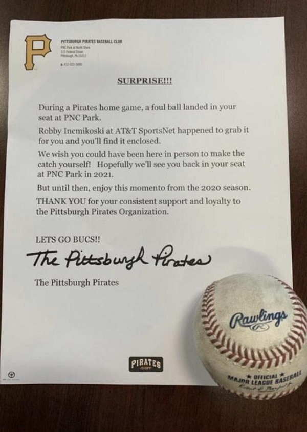 How cool is that?! I always hope to catch a foul ball at a ball game. I’m sure this fan had to be excited to get this. Kudos to the Pirates for doing this!