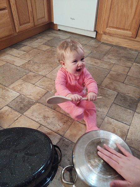 Sam was loading the dishwasher this week and she brought Ella into the kitchen. She put some pots on the floor and gave her a wooden spoon and the “music” began! I can’t even begin to tell you how cute this was! She’d rather hit the pots with her hands and chew on the spoon, but when she’s done teething I have a feeling there will be lots of noise!