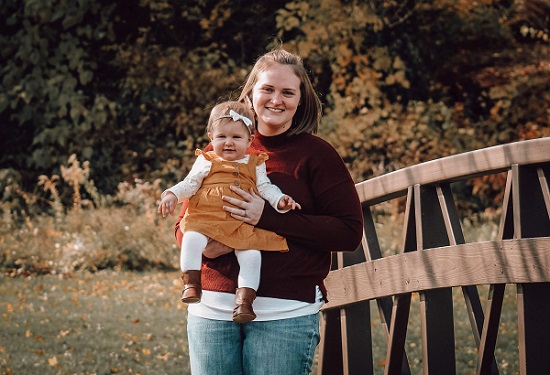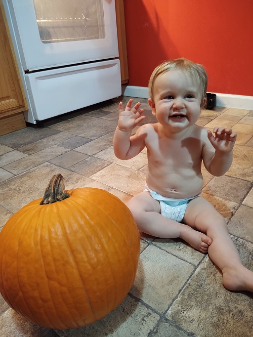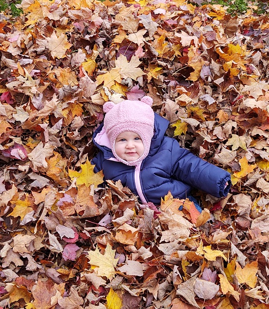 Monday, Sam worked days, so she was home by afternoon. We took a drive and grabbed pumpkin spice latte’s from Starbucks. When we got home, we raked up a big pile of leaves. We put the baby in her winter coat and let her sit outside and play in the pile. Look at this cutie: