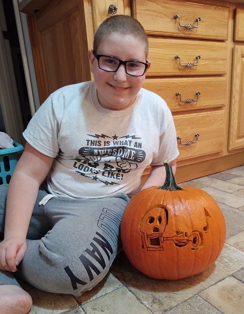 Dimitri carved a skeleton playing a trumpet. For Ella’s, we took a drill and drilled holes in it. It looks like polka dots when the candle is in it. She loved touching the pumpkin guts, which surprised all of us.
