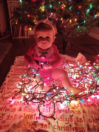 My wife comes up with the some of the coolest ideas for pictures. We were putting up the tree and had most of the lights on it. She ran to Ella’s room and grabbed the “First Christmas” blanket, and set her down with a strand of lights. It took a few shots, but this one came out pretty cool. I wish I had the app that lets you keep some color and put some of the picture in black and white. I just love the way that picture came out!