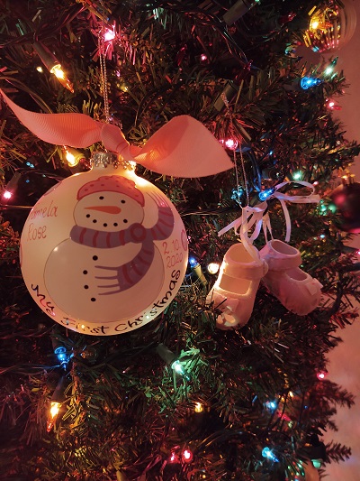 I mentioned last week that we had gone to Bronner’s in Frankenmuth to get Ella’s ornament. It made it on the tree, appropriately right next to the ornament Grandma Rose gave us (the baby shoes) when we mentioned we were having a girl.