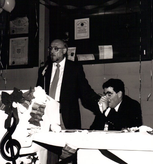 My Junior year, the officers were discussing the agenda for the annual Band Banquet. We needed one more speech, so I said I’d get up and do an imitation of Mr. Shaner. That night I was nervous. I got up and started my speech by saying “The longer you’re in band, the more Mr. Shaner starts to grow on you…” with that I ducked under the podium and threw on a bald cap. I then put a baton in the back of my shirt collar like he did. I “yelled” about how nobody practiced, talked about retiring and some other things. As the laughter died down, I realized I hadn’t written an “out”. I went on to thank Mr. Shaner for the many times he opened his office to listen to me talk about life, and issues I was dealing with. I don’t recall all I said, but I got pretty emotional and ended by telling him I loved him. He got up and we hugged. Somewhere I have a picture of that moment.