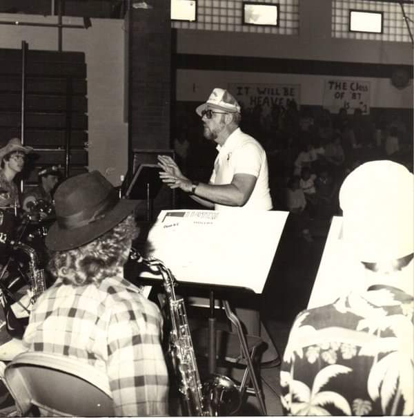 The above picture was taken of him conducting the Jazz Band. We rehearsed after school and we got to play at Pep assemblies. Jazz Band was so much fun. It was just a small group of us, and he seemed to really have more fun with us. I remember one of the songs we played was Delta Dawn (the Tanya Tucker song). The sax section had the melody and the harmonies were just fantastic. I was given the solo on a song called “In a Sentimental Mood”. I was scared to play it but he was so encouraging and I remember not being so nervous after he talked to me.