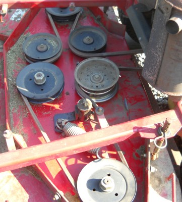 The belt/pulley system of these mowers is a little daunting: