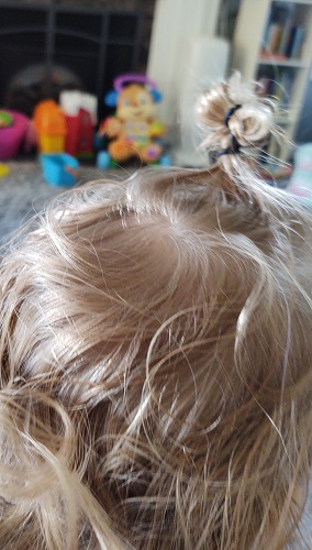 That’s how it should have all played out, but it didn’t. First of all, Ella was not about to sit still. Second, getting the hair through that rubber band is not as easy as I thought. Third, I could only get it to wrap around about three times.