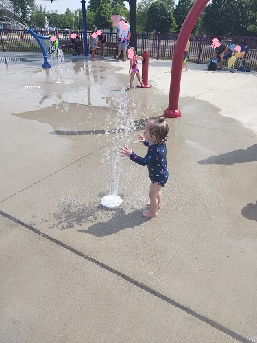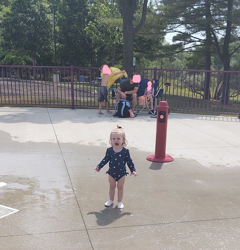 At any rate, she was sent home with an antibiotic and she’s been doing better. By Saturday, she was like her normal self. I was called off work Friday night, so I was able to get some sleep. Saturday was sunny and hot. We had heard about a splash pad near by and we decided to take Ella there. She loved it!