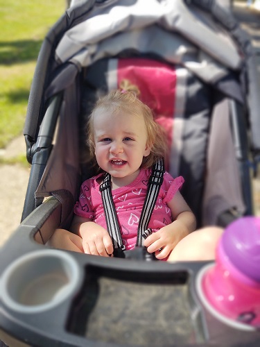 We all got a little sun Saturday. I was hoping to go back there today with her while Sam slept, but she spiked her fever again. I kept her inside most of the day. I made a trip out to Meijer with her to pick up a few things and when I got back she walked right to her stroller. She signed “more” to me, and I knew we had to take a walk. Because it was so sunny, I didn’t want her out there too long, so we did a quick walk around the block.