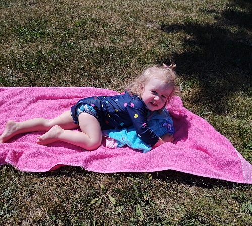 After her nap, she wanted to go outside. I had filled her pool, and figured she might want to just play in it. She sat in it for a bit, but for the most part, she wandered around the yard, playing on her slide, and “sunbathing”