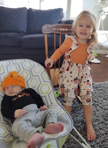 For Halloween, we had to make sure to let AJ wear his “My First Halloween” onesie. Ella happened to be wearing her Halloween dress, so we snapped a few pictures of them.