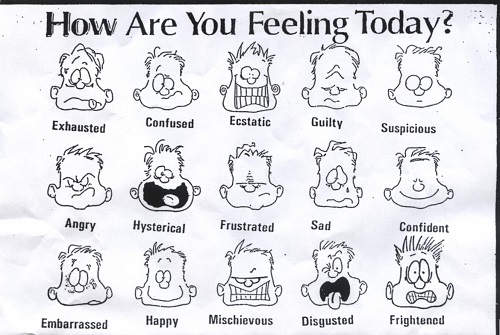 I used to see the above picture at a therapist’s office. There are more feelings on it than the ones seen above: enraged, ashamed, cautious, smug, depressed, overwhelmed, hopeful, lonely, lovestruck, jealous, bored, surprised, anxious, shocked, and shy. I’m sure there are many others that I am forgetting. I remember looking at the poster and wondering just where I fit in on that particular day – even though it was not my appointment!