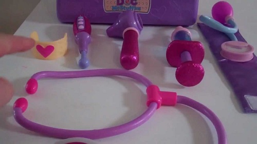 Ella got a Doc McStuffins doctor kit. It comes with the typical doctor toys – stethoscope, otoscope, fake shot, thermometer, bandage and bag. Take a look at the shot, which is the second from the right in the picture below.