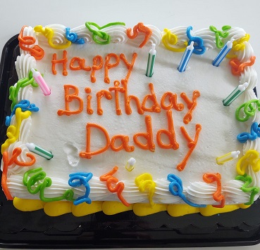 We stopped at Meijer and Ella went in with Sam while I drove around with Andrew, who was napping. When they were done shopping Ella was extra excited. She helped pick out a birthday cake. I guess Sam told her my birthday was coming up and she kept asking about birthday cake. They stopped at the bakery and Sam asked if they could write “Happy Birthday” on it. Ella said it needed to say, “Happy Birthday, Daddy,” so that is what was on it.