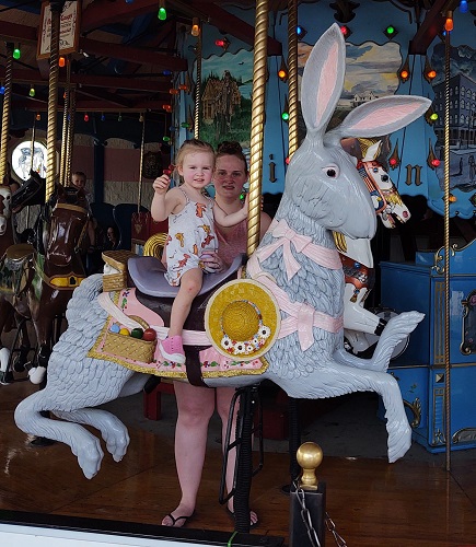 The kids love to ride the carousel too. Andrew was so hot by the time we got there, we figured we’d just keep him in the shade. Ella, of course, had to ride it like three times. Each time she rode a different horse/bunny. She loves it! It was great to watch her from the sidewalk and take pictures as she rode past me. Poor Sam, though. She was ready to throw up by the end of the third ride!