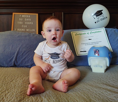 Originally, we were told he’d probably be wearing it until July. With each measurement that was taken from the beginning, his head continued to reshape itself quickly. Today, he was measured by the clinician and we were told that he would no longer need to wear it daily. Today was his Helmet Graduation!