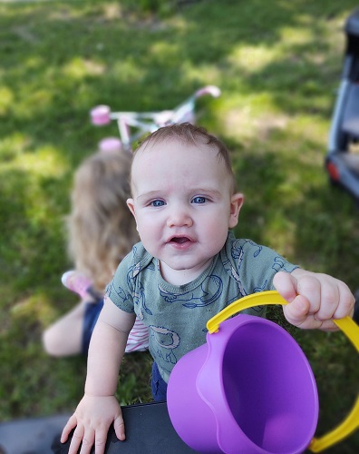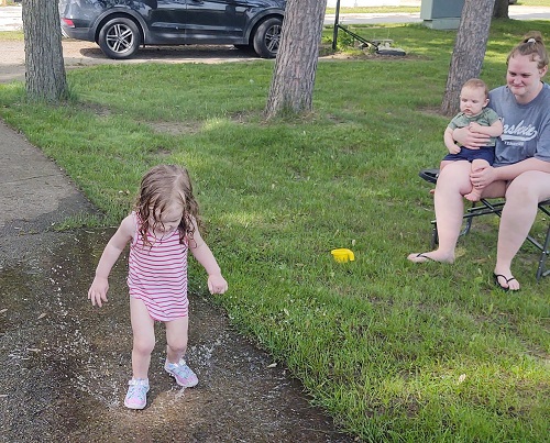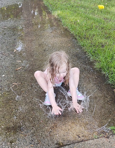 Andrew’s high chair needed a good cleaning. The last few meals were messy. So Sam took it outside and used the hose to clean it up. This caused a big pool of water to build up on the driveway, which Ella immediately wanted to play in!