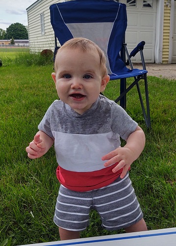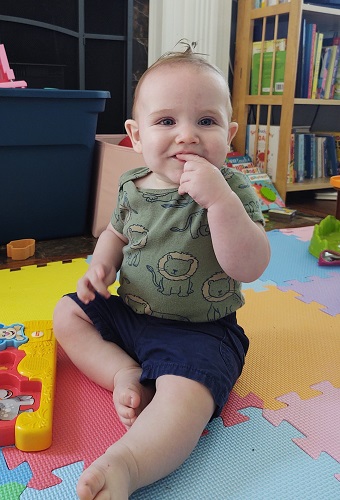 Andrew will be walking on his own and without any help VERY soon. He’s taken some steps randomly here and there. Yesterday, he took like 10 steps from the couch to where the cat was. That’s the most I’ve seen him take so far without falling.