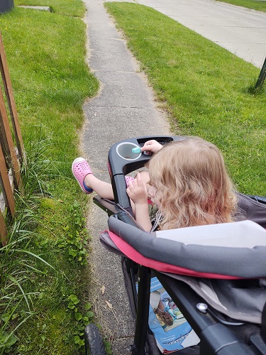 One day while he was napping, Ella and I went for a walk around the neighborhood. She always asks to see her “puppy friend.” Lately, the pup has been up on the back porch. She was so happy to see it closer.