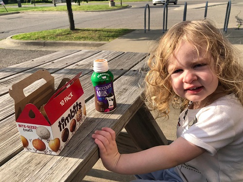 She got some mommy daughter time this weekend, too. Mommy took her out Monday morning for donuts. She got to order donuts for everyone. She knows dad likes Boston Cream, mom likes chocolate dip, and she loves Tim Bits. She loved sitting at the picnic table watching the cars go by before bringing home my donut.