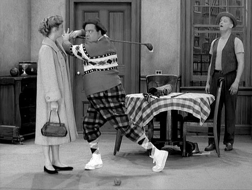 In one episode Ralph tells his boss he is a great golfer and is immediately asked to go play a round with him. Now Ralph needs to learn how to play – and fast. He finds the perfect teacher in his best friend Ed Norton. In pure Art Carney fashion, Ed reads from a book that you must “address the ball,” to which he takes the club, stands in front of the ball, looks down and says, “Hello, Ball!”
