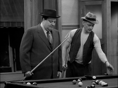 Another classic episode takes place at the pool hall where Ralph gets into an argument with the diminutive guy named George. “My friend is even bigger than me,” he tells Ralph. “I have a friend Shirley that’s bigger than you,” Ralph counters. But then he comes eye-to-chin with George’s friend, the towering Harvey, who challenges Ralph to a fight. This prompts Norton to observe: “He’s even bigger than your friend Shirley.”