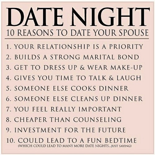 This may sound ridiculous, but knowing that we will have this time together tomorrow has me so very excited. There is a new found energy in anticipating our date tomorrow. Even this morning, when I got home from work, I watched my wife as she walked into the kitchen and took in all her beauty. My mind raced as I thought about just being able to sit across from her and have the opportunity to hold her hand and look into her eyes. I’m excited to be able to kiss her without the cries of a child interrupting that moment. I can’t wait to hug her without a tug on my pant leg because of spilled milk that needs to be cleaned up.