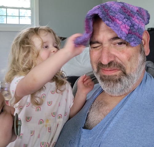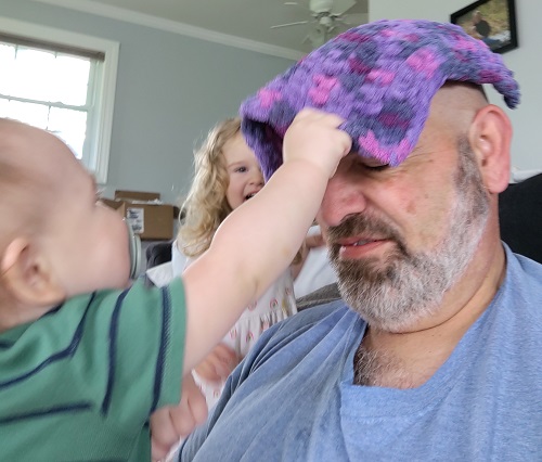 When Andrew pulled it off my head, I would yell, “My Hat!” This would make Andrew laugh out loud. Once that happened, it started to crack Ella up, too!