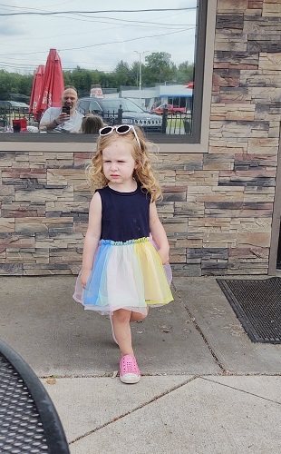 Eating outside also allowed for Ella, who isn’t really great about sitting still, to wander a bit. There was a family who came out the patio and sat a table or so away from us. I guess the kid hurt himself, and Ella really wanted to help him. She said, “Kiss and make it better?” We told her that the boy’s mommy would do that for him.