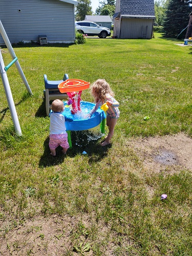 Sam said if it was warm enough to put them in their bathing suits and let them play with the water table and little pool. The two of them had a blast. As much as Ella gets to where she doesn’t want Andrew around her, outside she welcomes him as a playmate. They splashed together, she poured water on him, and they got muddy together.