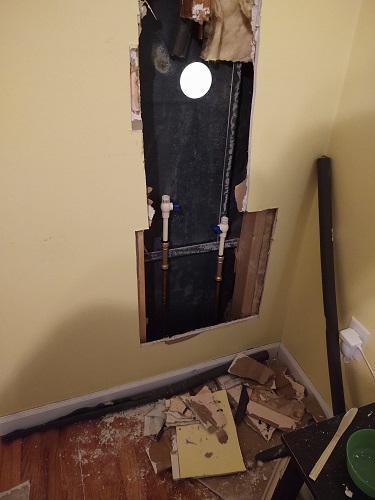 We finally can see the place where the valve is. The shower enclosure is right up against the pipes and a bear to get to. They are copper, so my father-in-law says that we are going to put in new pipe, and shut offs.