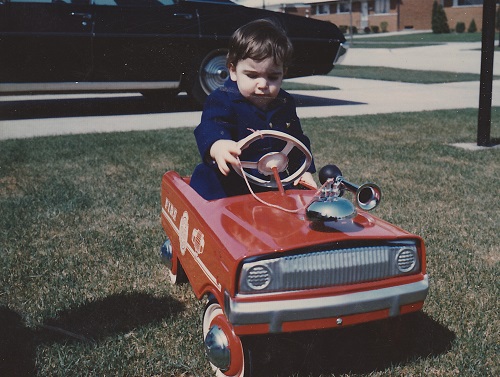 Look at that fire truck! It was all metal! I can’t recall, but I think it had pedals (sort of like a tricycle) and you could “drive” it around. There are not many pictures of me with it, but I wish there were more. Somewhere my dad has old 8mm home movies and one of them has my mom pushing me down the hallway of our house in this fire truck.