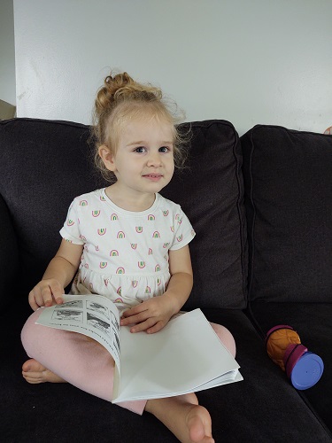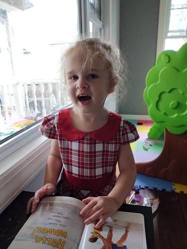 When we returned home, she began to read books. Most of the time they are books off her shelf.