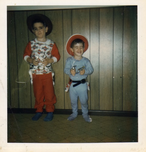 Outside of the terrible paneling, the first thing that jumps out at me is the extremely cheesy smile on my brother’s face. As a matter of fact, that’s why I chose this picture. I chuckled out loud when I saw it. The laughter was brought on partly by his grin and partly by the fact that we are dressed as cowboys in PJ’s!