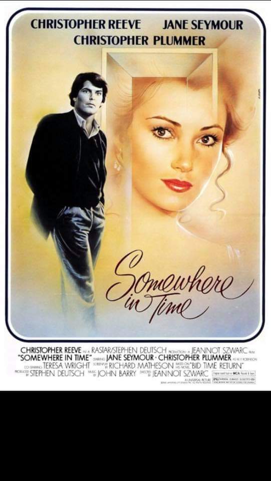 It starts Christopher Reeve, Jane Seymour and Christopher Plummer. Basic plotline: In 1972, playwright Richard Collier (Christopher Reeve) becomes fascinated by a photo of Elise McKenna (Jane Seymour), a turn-of-the-century stage actress, while staying at the Grand Hotel in Mackinac Island, Michigan. As Richard’s obsession grows, he learns from a friend that time travel may actually be possible through hypnosis. Richard travels in time to meet Elise, and the two appear destined to be together. However, Elise’s jealous manager (Christopher Plummer) attempts to keep them apart.