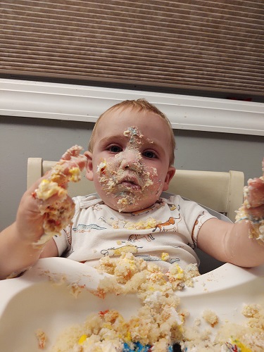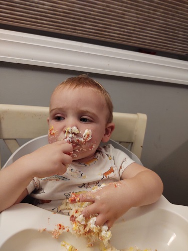 It was very fun to watch. He just kept grabbing chunks of cake and stuffing his face. I swear, he ate 3/4 of that cake! I’m surprised he fell asleep tonight after eating all that sugar!!