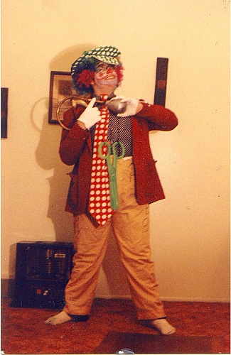 The only other Halloween picture I have is from my Sophomore year of high school. The band had a Halloween party at some barn as I recall and we all went to it. I didn’t know what to go as, and decided on going as a clown. I threw on a pair of pajama pants over my jeans, one of my dad’s old shirts, an awful sport coat, clown wig, hat and tie, and added a huge horn. It was ridiculous!