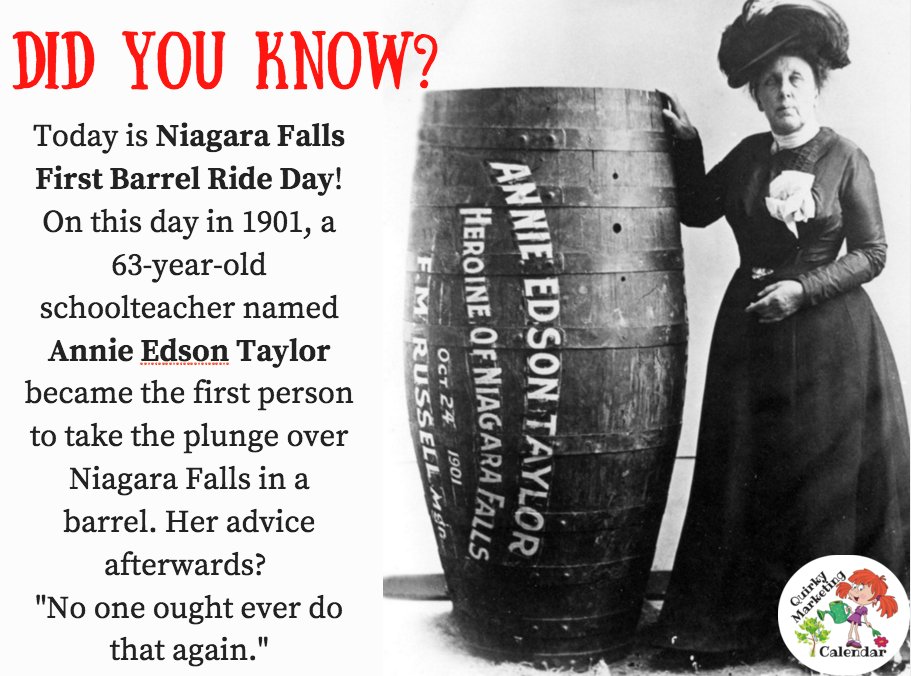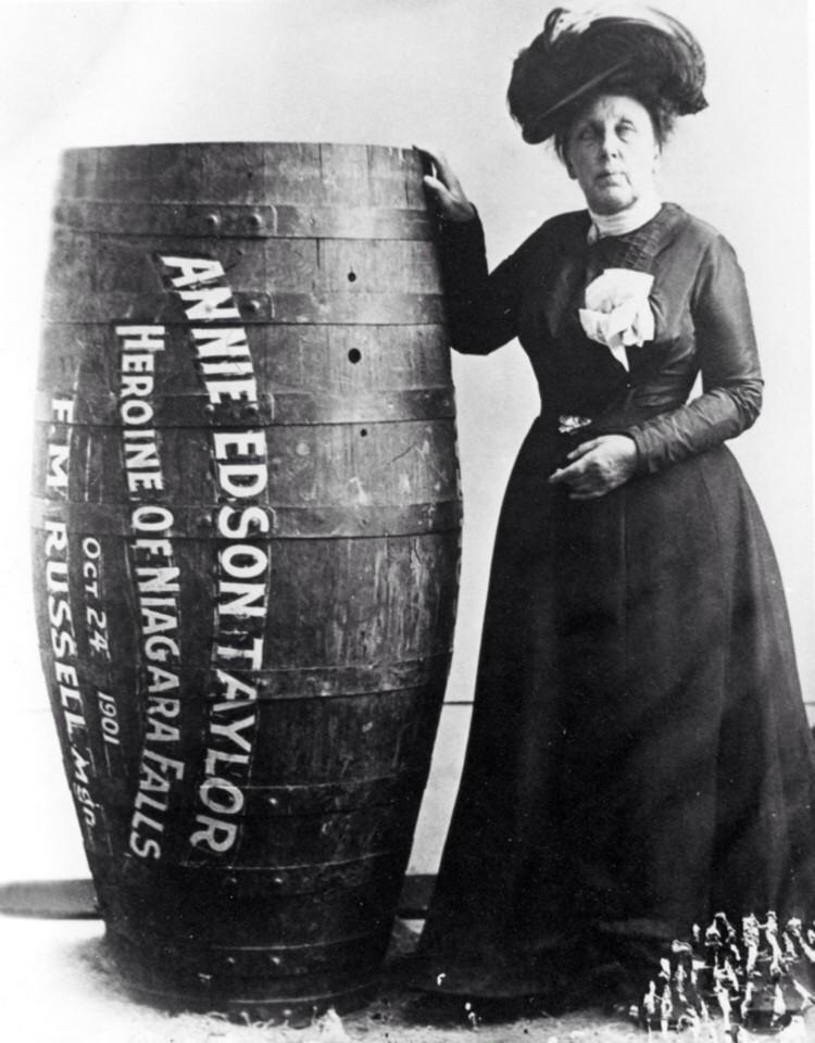 Annie Edson Taylor of Bay City, MI was the first to survive a trip over Niagara Falls in a barrel. She used a custom-made barrel with padding and leather straps. She climbed inside the airtight barrel, the air pressure was compressed with a bicycle pump and on her 63rd birthday, October 24, 1901, with her pet cat cradled in her arms, she headed down the Niagara River towards Horseshoe Falls. After the plunge, rescuers found her alive with only a small gash on her head. She was hoping for fame and fortune with her stunt, but she died in poverty.