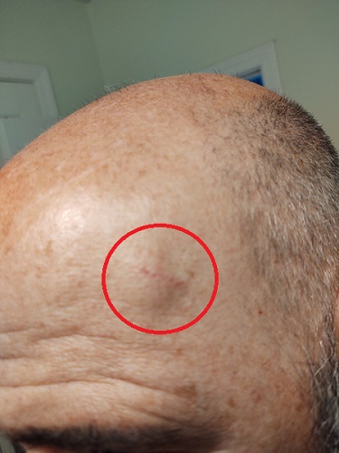 The goose egg had gone down a lot by the time I took a picture of it. You can still see it and it still hurts like a bugger!!