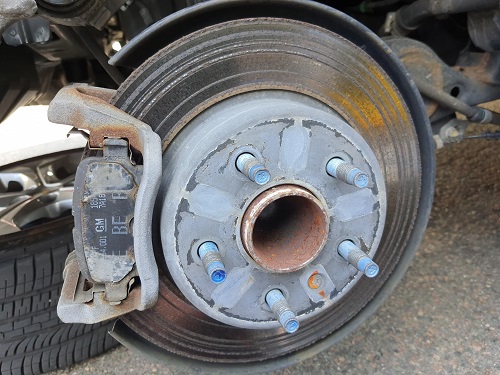 The day I noticed it, I pulled into work and could see that the pad was tearing a huge gouge right in the middle of the rotor. The other side was fine. I couldn’t really figure out what happened. My brother-in-law and father-in-law thought I might have gotten a set of bad pads and one cracked. By the time we got a day to work on them, that pad had tore up the entire rotor on that side.