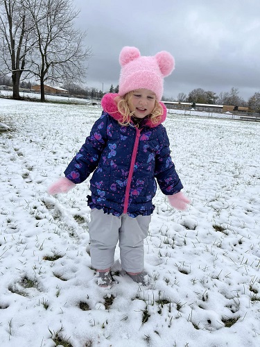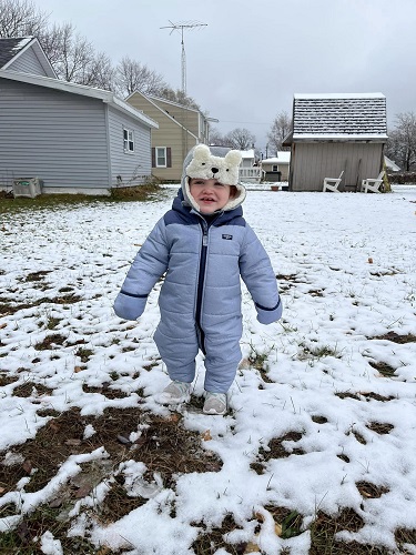 When Ella woke up this morning, she looked out her window and saw the snow on the ground and immediately wanted to go outside and play! She loves to be outside! However, she had to wait a bit because Andrew had an appointment. I got the kids breakfast and packed up the diaper bag so that when Sam finished getting ready, they could get right out and on the road.