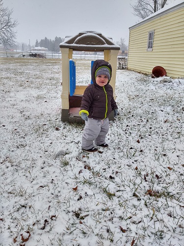 Sunday, we got a little snow. Sam promised the kids that we could go out and play in it. So we all bundled up and went outside as the snow fell.
