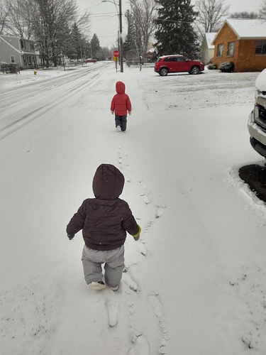 We attempted to build a snowman, but Andrew kept tackling it or picking up the snowballs to throw. Ella was in the middle of the yard and said, “Let’s take a walk, daddy!” So we did.