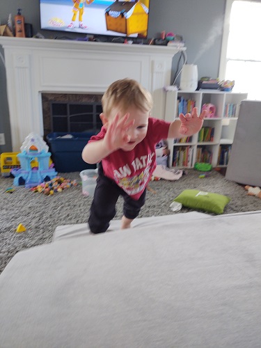 Having to stay indoors can be boring for the kids. So we took the “nugget” (which you can see on the floor to Ella’s right in the picture above) and built a mountain for them to climb and play on. I tried to get some pictures of them playing on it and I snapped a cool one of Andrew.