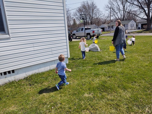 The weather was perfect! Loads of sunshine and decent temperatures. It had rained a day or two earlier and the back yard was a little muddy, so the hunt was done in the front yard. Parents were out making sure that each kid got their fair share of eggs!