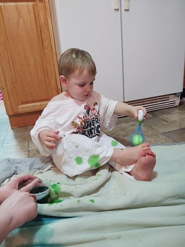 We took an old comforter, grabbed some of the shirts that were to small for Dimitri and let Ella and Andrew wear them. My Facebook status read: “Colored some eggs tonight. Coincidentally, we also colored the blanket, the kitchen floor, Ella’s legs, and Sam and Andrew’s hands.”