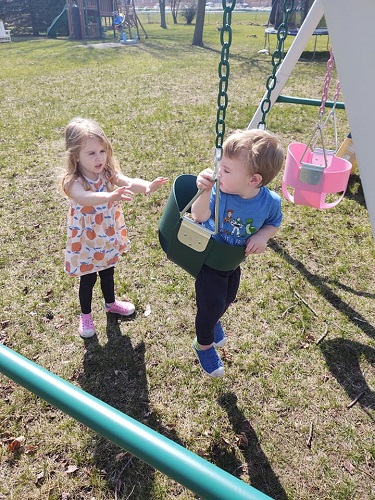 … and despite the look on her face in the above picture, she actually asked to push her brother on the swings…