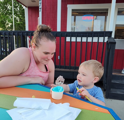 We got there just before a bunch of people lined up behind us. Sam took the kids and grabbed a table for us to sit at. One by one, the worker passed me each of our items. Ella was happy as a clam eating her sprinkles. Andrew ate some of his Blue Moon ice cream, but eventually wanted to eat from mommy’s cone. This led to Ella wanting to “try” mine, and by the end of the visit, Sam and I lost our ice cream!