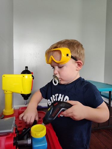 He also got some “power tools” that we got from Sam’s Club. They really look like Bosch tools and they all make noises. The drill actually lets you drive a screw in and reverses to get them out. He figured that out on his own. He is loving this!