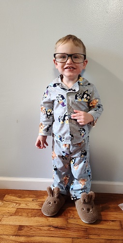 Next test is his EEG to check out the Neuro stuff. One of the things they told us was that he needed button up pajamas for the study. Sam found a few pair and I’m not going to lie – I think they look cute on him! Of course, the slippers and my reading glasses make him look like a little old man!